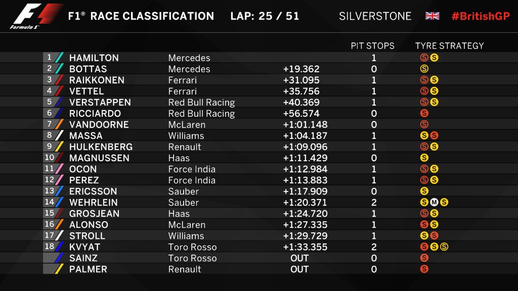 22-й круг: лидируют Хэмилтон, Райкконен, Боттас, Феттель, но просветы между ними огромные. Замыкают гонку Верляйн, Квят и Алонсо.