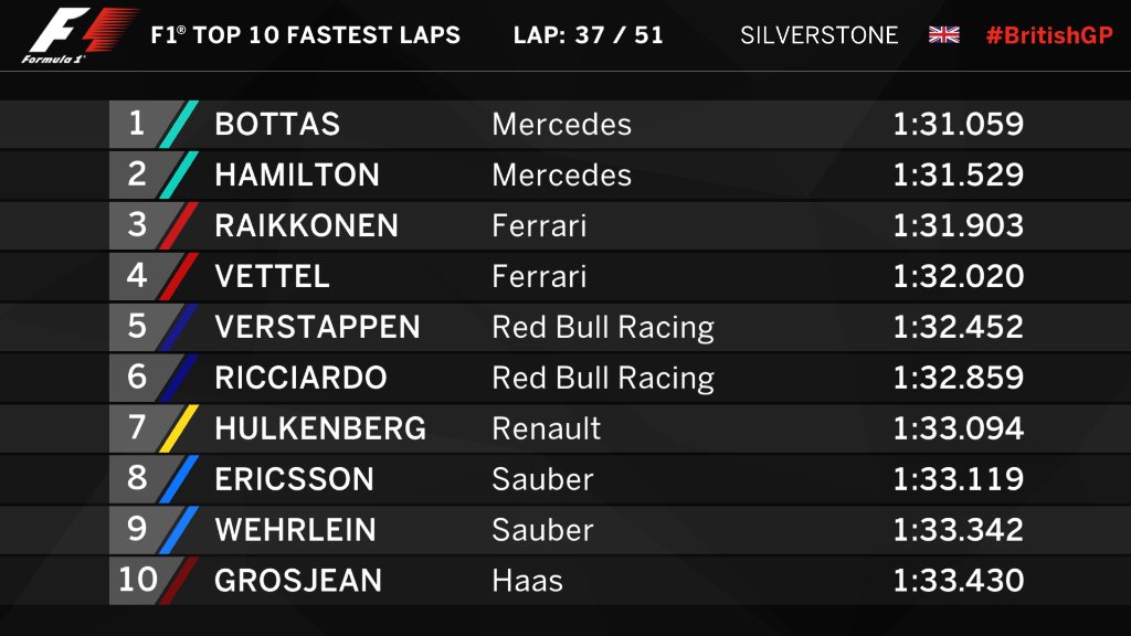 4,5 секунды между Хэмилтоном и Райкконеном, почти 12 секунд разделяют Верляйна и Квята.