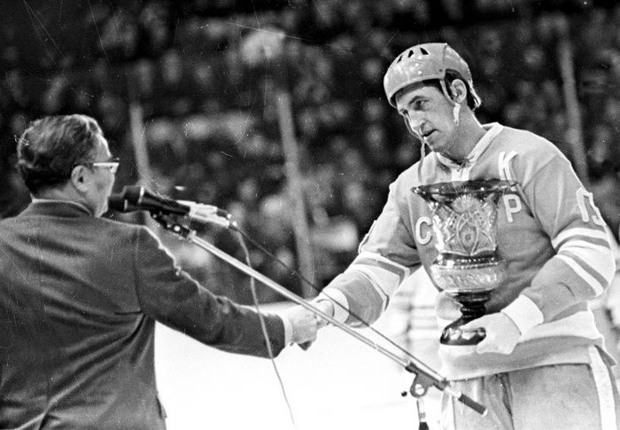 1973 год. Капитан сборной СССР Борис МИХАЙЛОВ получает "Приз "Известий". Фото - Анатолий БОЧИНИН