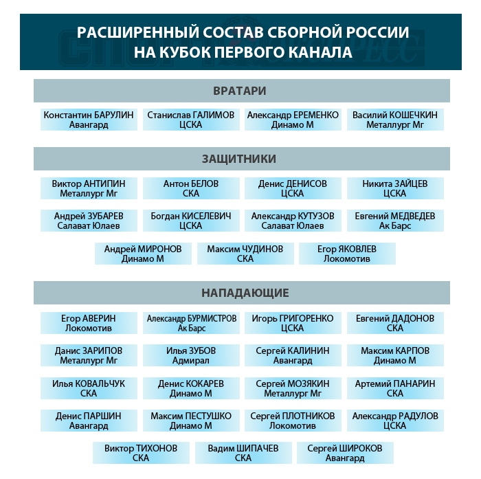 В расширенном составе сборной России на Кубок первого канала - 15 чемпионов мира Минска
