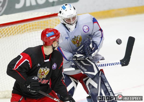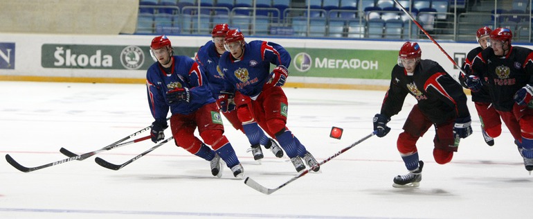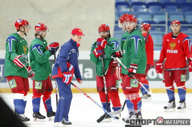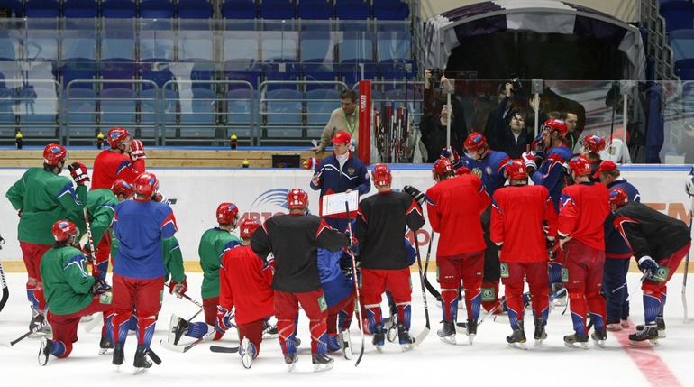 Тренировка сборной России по хоккею накануне матча с Финляндией в Мытищах на третьем этапе Евротура. Капитаном национальной команды на предстоящем турнире будет защитник магнитогорского "Металлурга" Виталий Атюшов. Фото - Алексей ИВАНОВ, "СЭ"