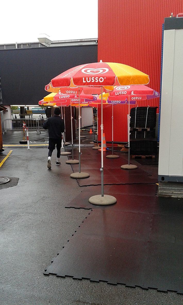 Часть пути к ней с площадки пролегает под открытым небом. Утром во время раскатки шел дождик, поэтому дорогу укрыли зонтиком, но не полностью.