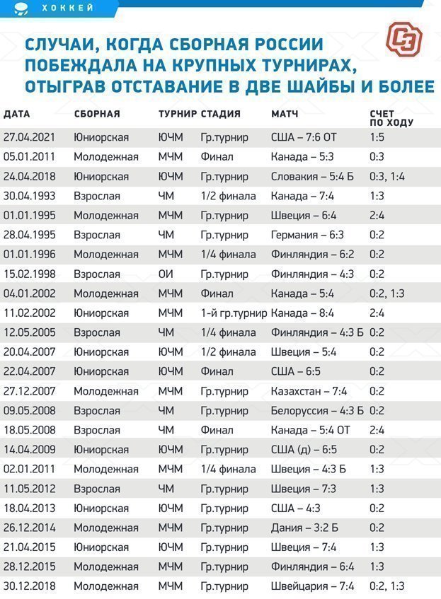 Россияне, уступавшие к 25-й минуте со счетом 1:5, третий период начали при минимальном отставании, а в овертайме добили соперника. Ранее наши команды 21 раз добивались успеха в матчах, в которых отыгрывали «-2» и дважды — «-3». Преобразовать 0:3 в победу получалось у молодежки в финале МЧМ-2011 с канадцами и у юниорки — в группе ЮЧМ-2018 со словаками.