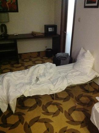 Нападающий "Трактора" Евгений Кузнецов нашел повод пошутить об условиях проживания в Хабаровске, куда челябинцы отправились на матч регулярного чемпионата КХЛ с "Амуром". Форвард сборной России в своем твиттере разместил фотографию гостиничного номера с раскладушкой.