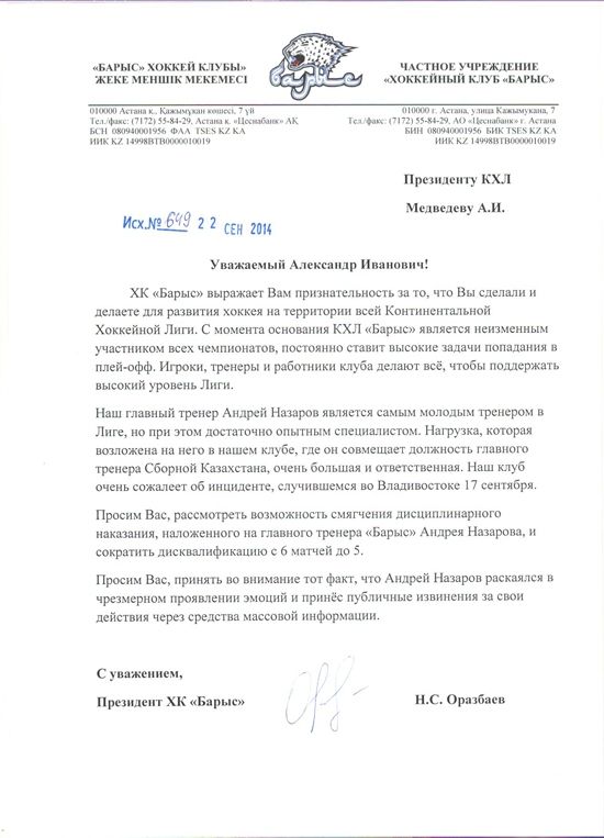 "Барыс" направил письмо президенту КХЛ Александру Медведеву с просьбой о сокращении срока дисквалификации главного тренера команды Андрея Назарова. Напомним, что наставник клуба был отстранен на шесть матчей за некорректное поведение в игре регулярного чемпионата КХЛ против "Адмирала" (2:3).