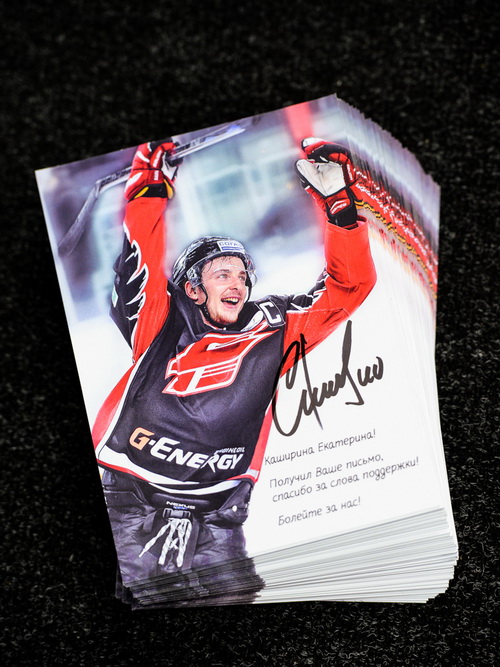 Капитан "Авангарда" Сергей Калинин, получивший травму головы по ходу шестого матча серии 1/8 финала Кубка Гагарина в Астане против "Барыса", ответил на письма болельщиков, пожелавших ему скорейшего выздоровления, сообщает официальный сайт омичей. Всего нападающий получил более 300 писем и в ответ на каждое из них направил фотографию с автографом и следующим текстом: "Спасибо за слова поддержки, болейте за нас!"