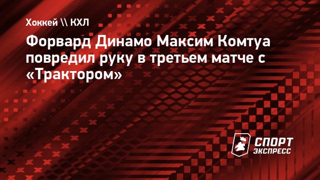 Нападающий «Динамо» Максим Комтуа повредил руку в третьем матче полуфинальной серии Кубка Гагарина против «Трактора» (2:3 2ОТ).