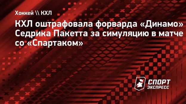 Спортивно-дисциплинарный комитет КХЛ оштрафовал форварда «Динамо» Седрика Пакетта за симуляцию в матче со «Спартаком» (2:4) в FONBET чемпионате КХЛ.