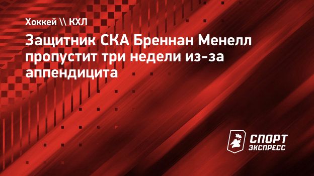 Защитник СКА Бреннан Менелл выбыл на три недели из-за аппендицита, сообщил главный тренер армейцев Игорь Ларионов.