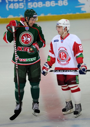 Хоккей. Одинцово. Контрольный матч. "Ак Барс" (Казань) - "Витязь" (Московская область) - 3:1 (1:1, 0:0, 2:0). Голы: Тарнаски (Точицкий), 11:13 (1:0). Дарзиньш (Иммонен, Миеттинен), 19:14 (2:0 - бол.). Петров (Казионов, Князев), 48:56 (2:1). Ломако (Голубев), 58:41 (3:1). Нереализованный буллит: Панарин, 26:38 (вратарь). После матча хоккеисты казанского клуба совершали пробежку возле ледового дворца и набегу раздавали автографы юным болельщикам. Фото - Федор УСПЕНСКИЙ, "СЭ"