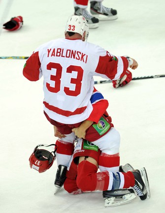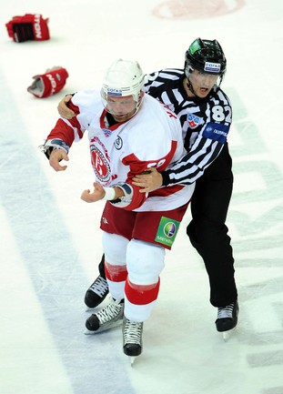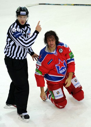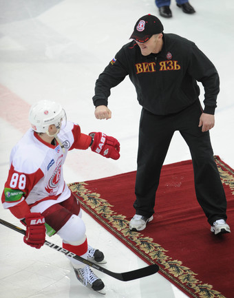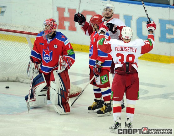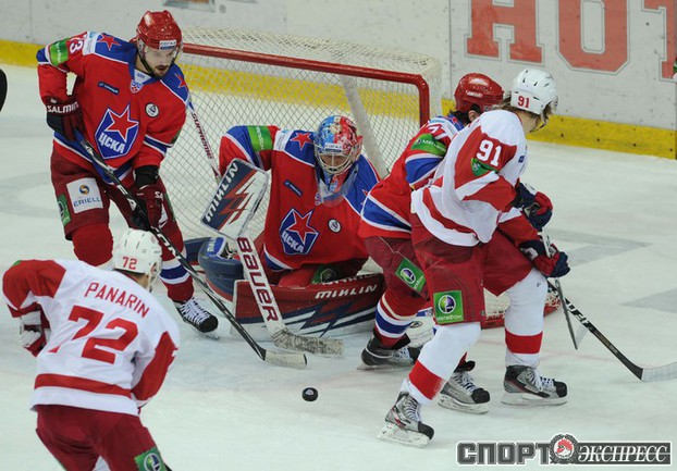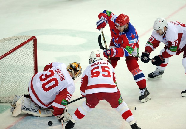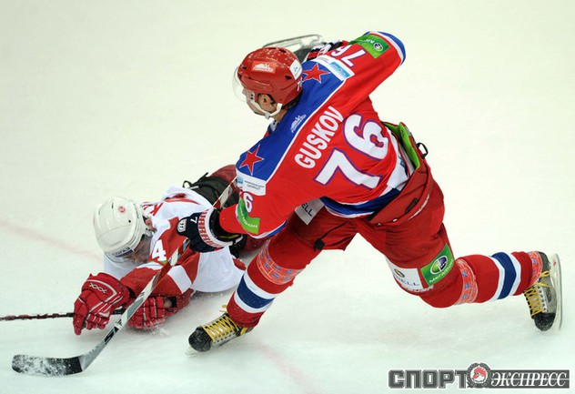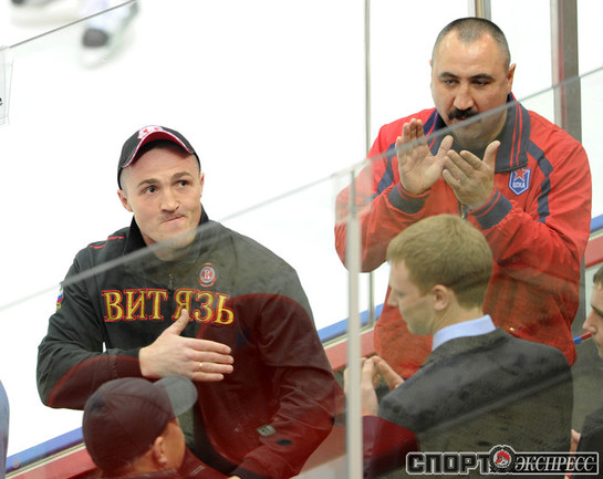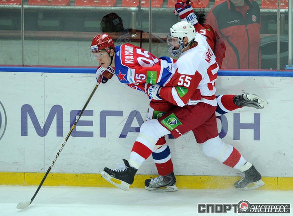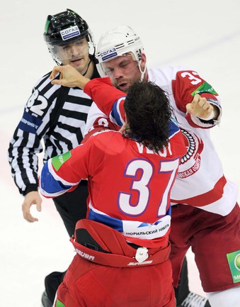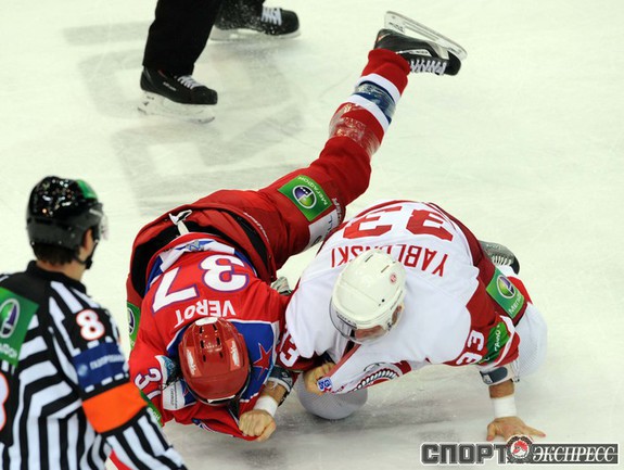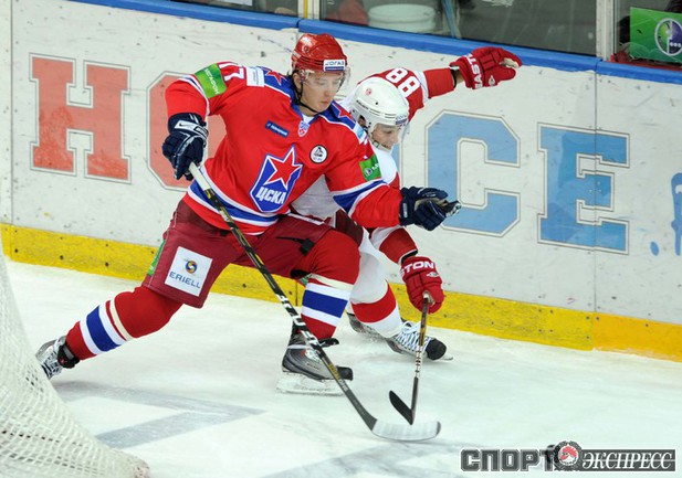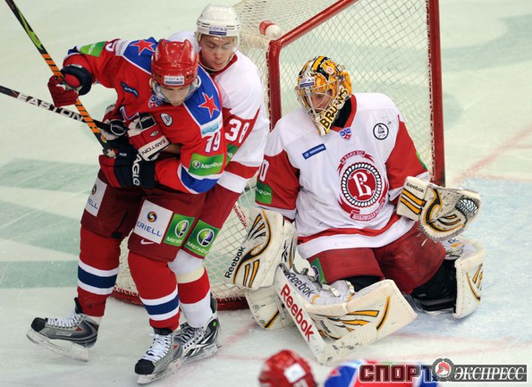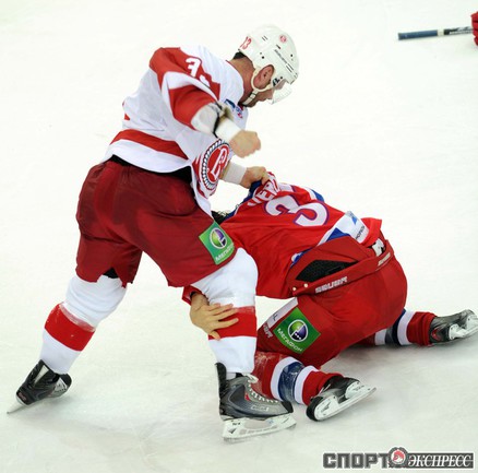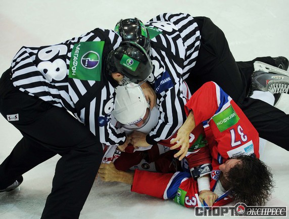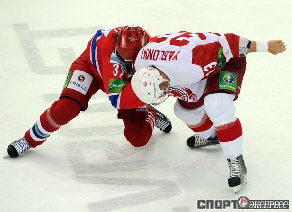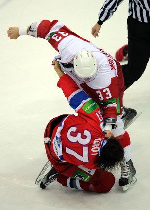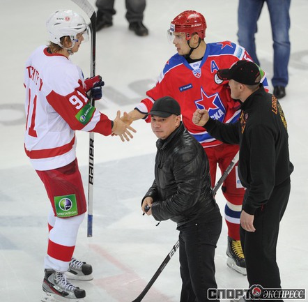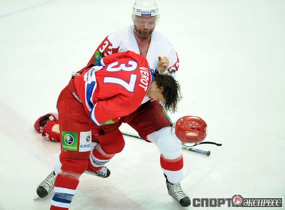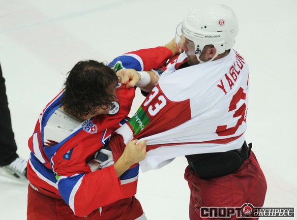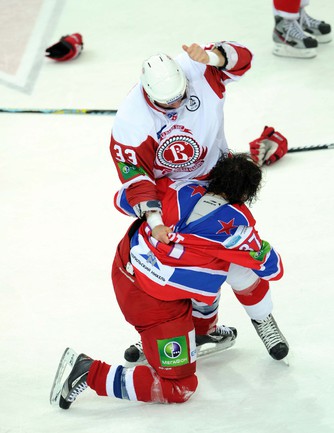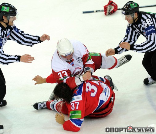 КХЛ. Регулярный чемпионат. ЦСКА (Москва) - "Витязь" (Чехов) - 1:2 Б (0:0, 1:0, 0:1, 0:0, 0:1). Голы: Яшин - 3 (Широков), 35:48 (1:0). Тарнаски - 2 (Марков, Федосеев), 42:20 (1:1 - бол.). Победный буллит: Белоусов. В хоккейном матче победили подмосковные хоккеисты, а двухраундовый (в первом и втором периоде) поединок бойцов завершился удалением обоих до конца матча. Фото - Федор УСПЕНСКИЙ, "СЭ"
