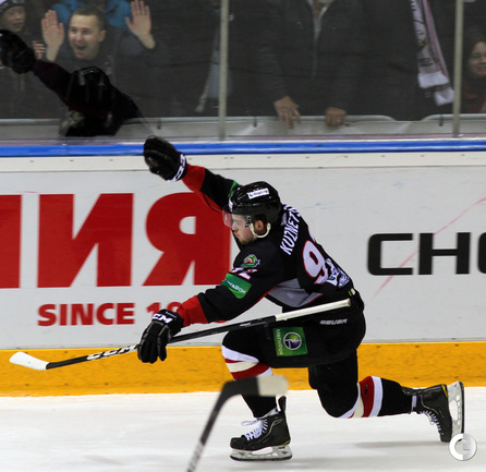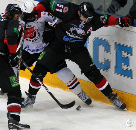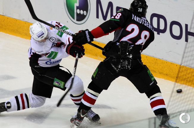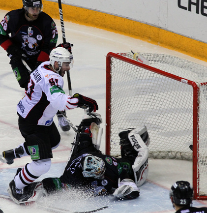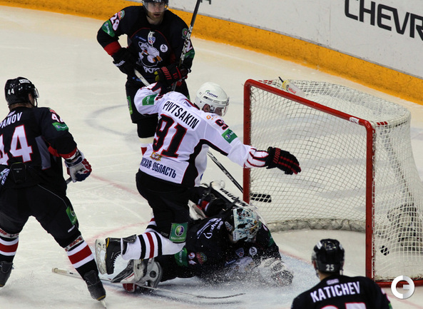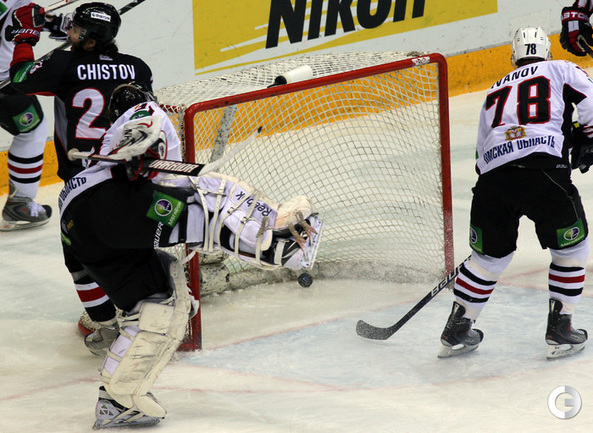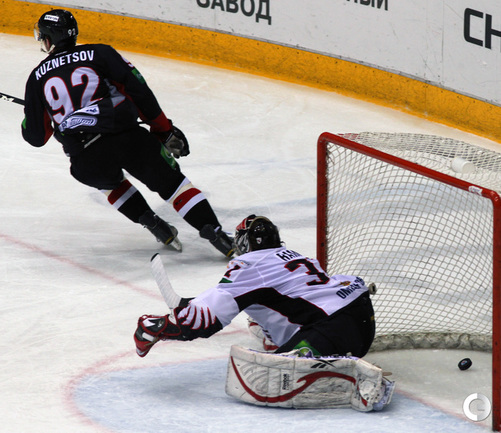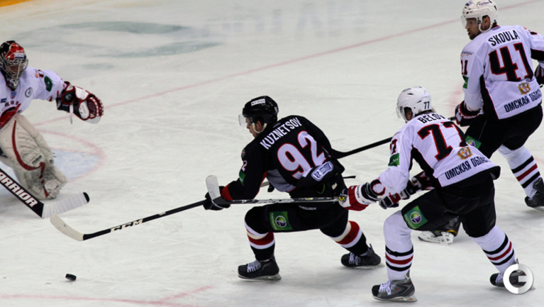 31.03.2012 года. Челябинск. "Трактор" (Челябинск) - "Авангард" (Омск) - 2:3 2ОТ (1:1, 1:0, 0:1, 0:0, 0:1). Голы: Семин - 2 (Курьянов), 2:29 (0:1). Кузнецов - 6 (Куинт), 9:23 (1:1 - бол.). Кузнецов - 7 (Рябыкин), 35:09 (2:1 - бол.). Пережогин - 4 (Салмела), 40:36 (2:2). Пивцакин - 3 (Червенка), 86:01 (2:3). Фото Игоря ЗОЛОТАРЕВА