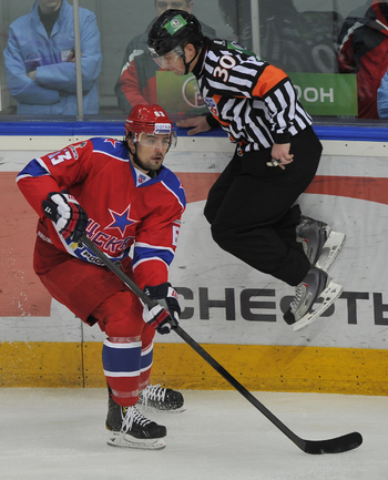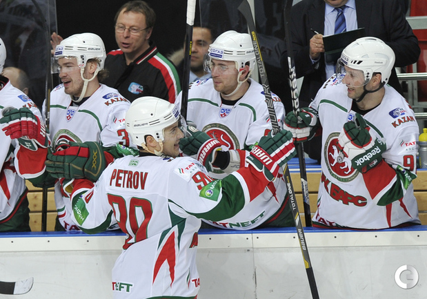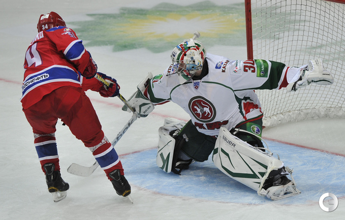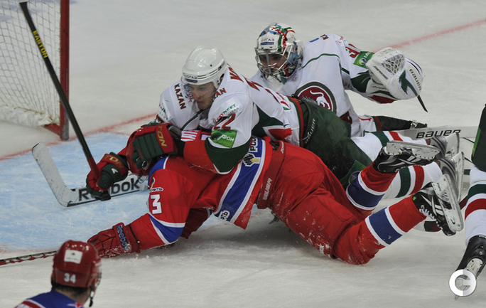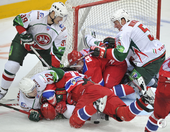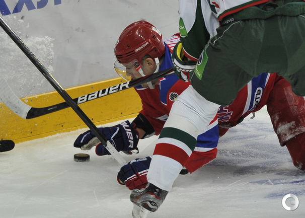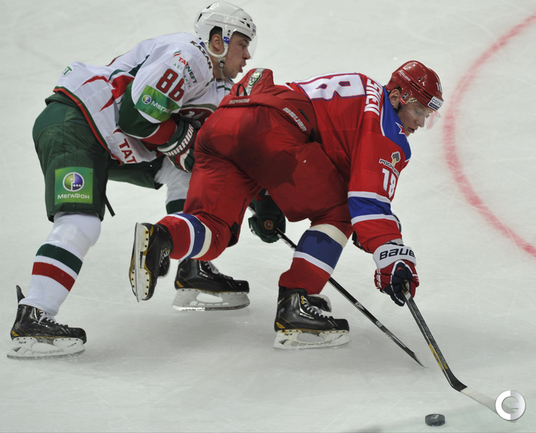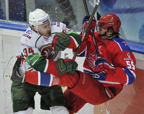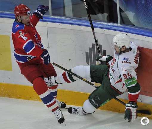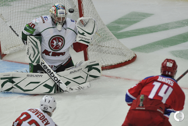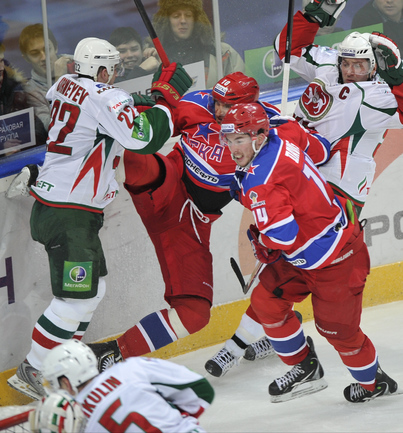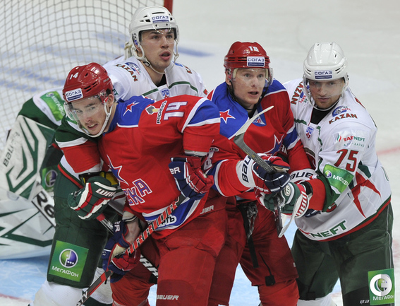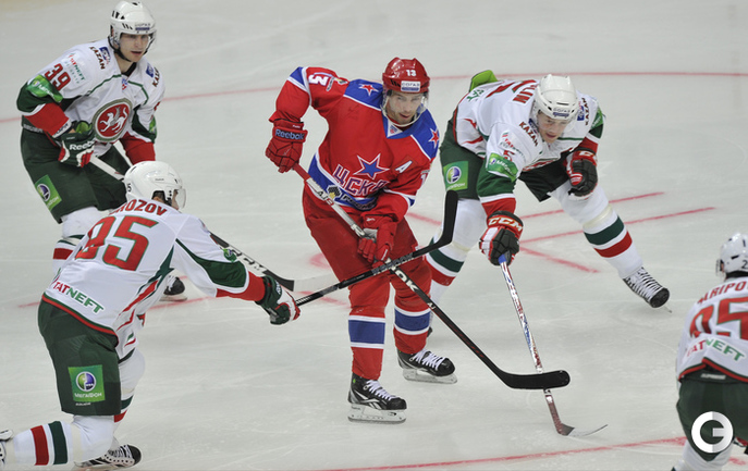 КХЛ. Регулярный чемпионат. ЦСКА - "Ак Барс" (Казань) - 1:2 (0:0, 1:2, 0:0). Голы: Дэвис - 3 (Буравчиков), 25:19 (1:0). Петров - 8 (Терещенко, Емелин), 29:22 (1:1). Петров - 9 (Дарзиньш, Терещенко), 37:19 (1:2). Армейцы проводили первую игру после отставки Валерия Брагина под началом и.о. главного тренера Вячеслава Буцаева. Форвард красно-синих Александр Радулов, не игравший в заключительной встрече сборной России на Кубке Первого канала-2012 из-за травмы ноги, пропустил встречу из-за болезни. Фото - Александр Федоров, "СЭ"
