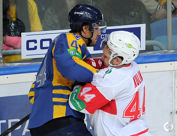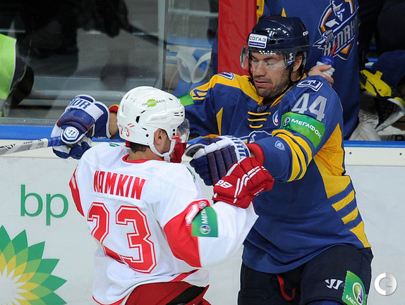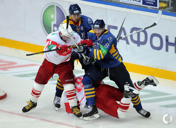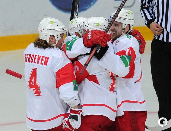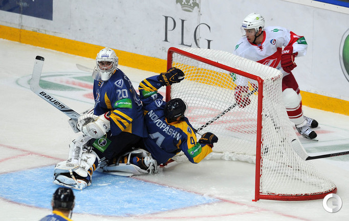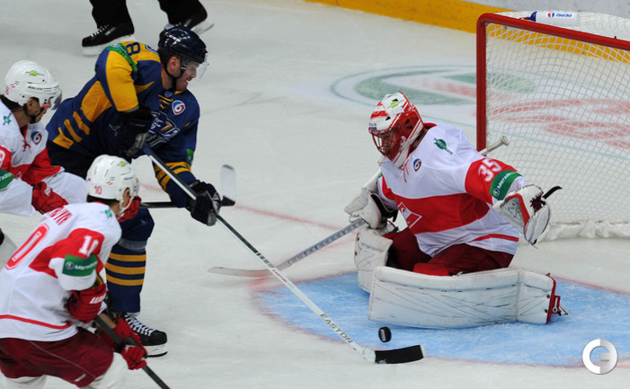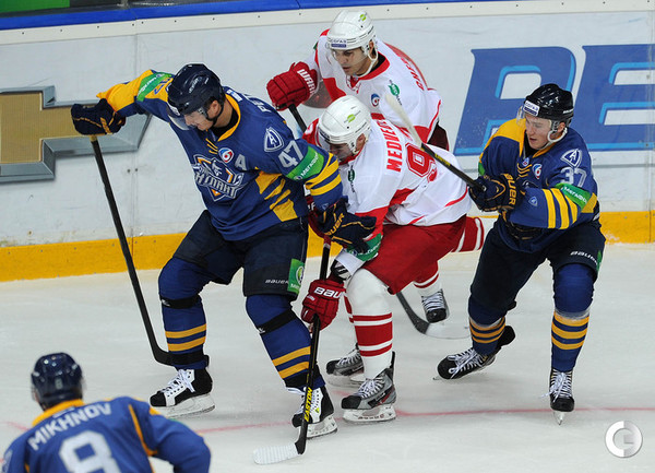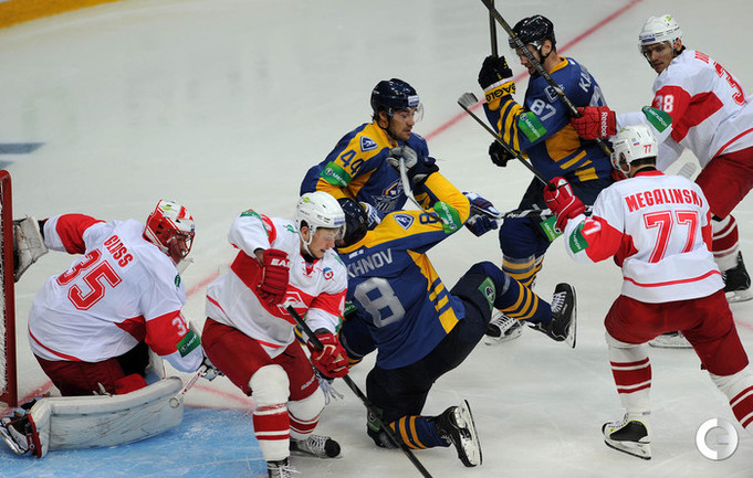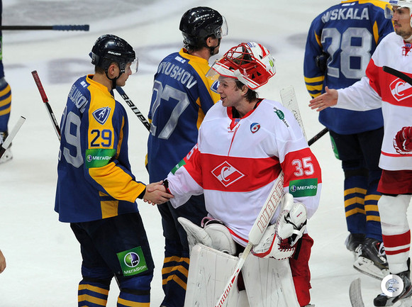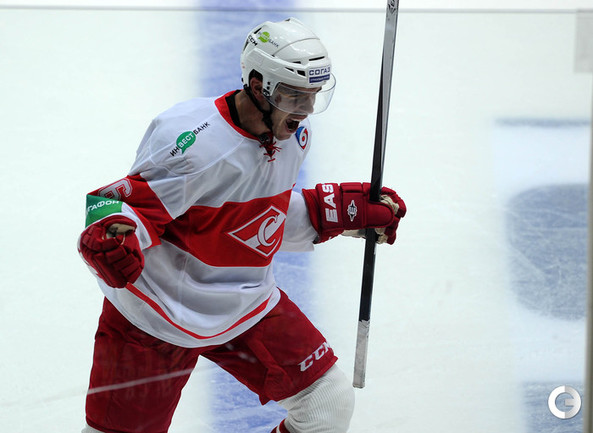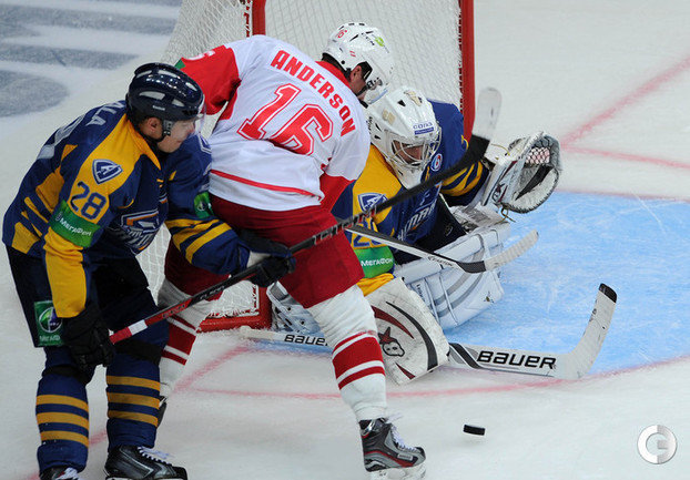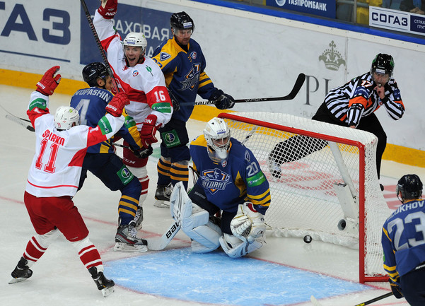 05.09.2013. Хоккей. В стартовом для "Атланта" и "Спартака" матче регулярного чемпионата-2013/14 в Мытищах верх взяли гости – 2:0. На 23-й минуте победную шайбу провел Растислав Шпирко, он же установил окончательный счет голом в пустые ворота. Фото - Алексей Иванов, "СЭ"