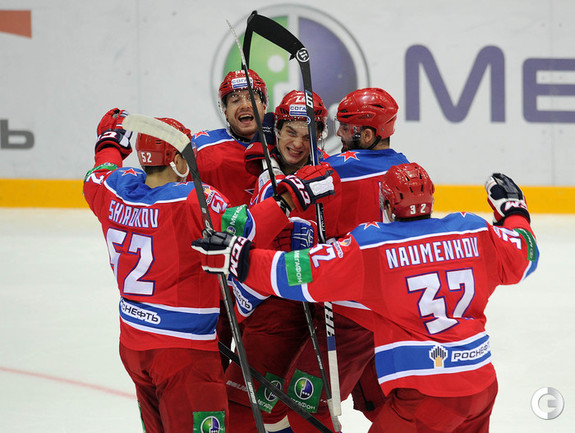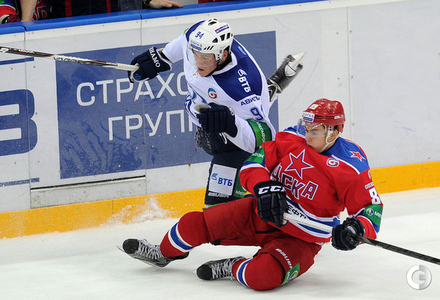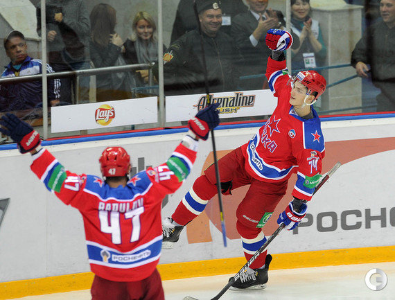КХЛ. Регулярный чемпионат. ЦСКА – "Динамо" (Москва) – 6:3 (2:1, 1:2, 3:0). Голы: Прохоркин – 2 (Радулов), 9:23 – 1:0. Зубов – 1 (Широков, Прохоркин), 12:26 – 2:0. Карпов – 1 (Бабенко), 19:22 – 2:1. Прохоркин – 3 (Мишарин, Радулов), 23:05 – 3:1. Цветков – 2 (Новак, Комаров), 36:29 – 3:2. Цветков – 3 (бол., Кокарев, Соловьев), 37:36 – 3:3. Прохоркин – 4, 45:32 – 4:3. Сапрыкин – 2 (Жарков), 46:12 – 5:3. Зубов – 2 (Широков, Стана), 55:34 – 6:3. Главным хероем игры стал молодой форвард ЦСКА Николай Прохоркин. Сегодняшний именинник оформил в этой встрече хет-трик и отдал одну результативную передачу. Фото - Алексей ИВАНОВ, "СЭ"
