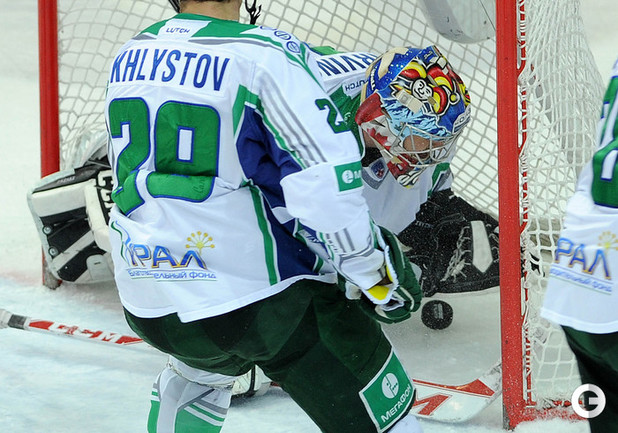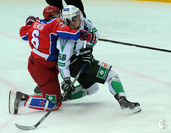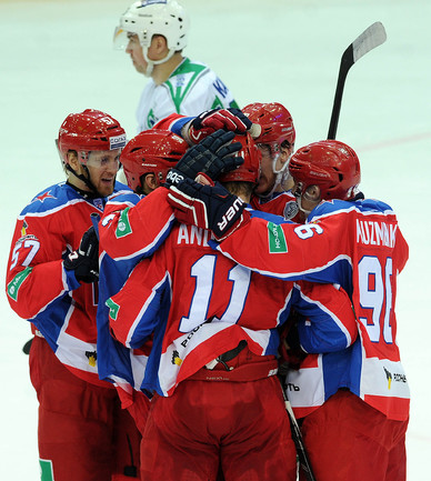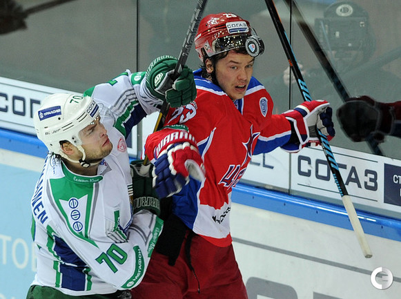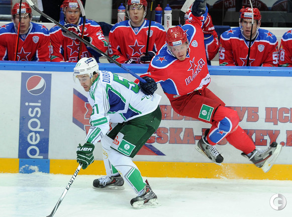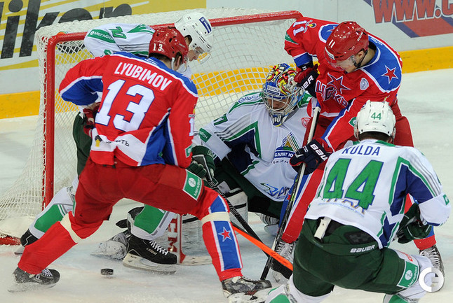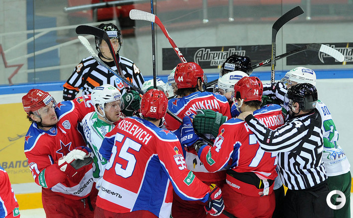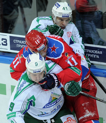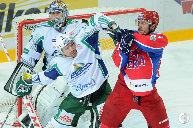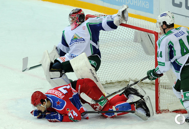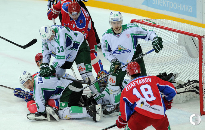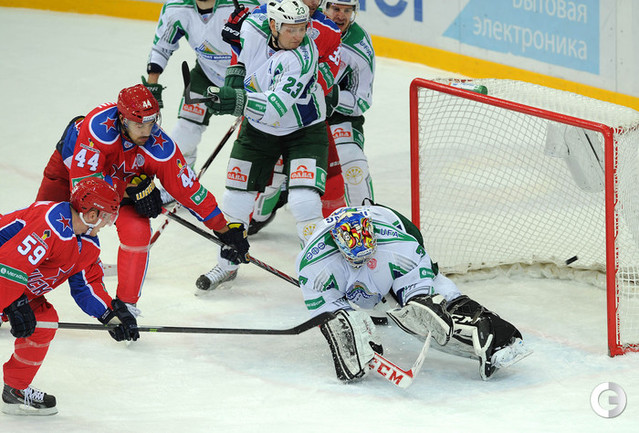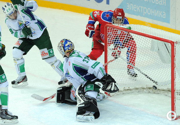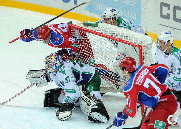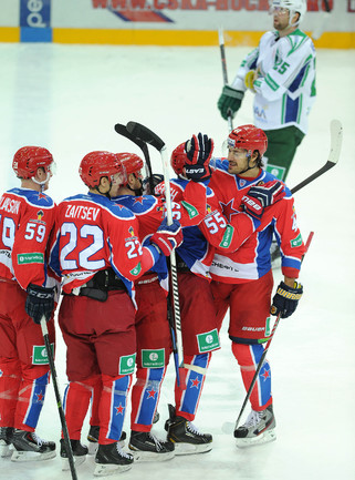 Москва. Регулярный чемпионат КХЛ. ЦСКА (Москва) – "Салават Юлаев" (Уфа) – 7:0 (0:0, 6:0, 1:0). Голы: Стась – 3 (Жарков, Денисов), 24:38 – 1:0. Киселевич – 2 (бол., Хьялмарссон, Зайцев), 31:25 – 2:0. Андронов – 3 (Панин), 35:41 – 3:0. Жарков – 4 (Науменков), 38:26 – 4:0. Хьялмарссон – 2 (Артюхин), 38:44 – 5:0. Кузьменко – 1 (Любимов), 39:42 – 6:0. Хьялмарссон – 3 (Егоршев), 46:33 – 7:0. Эту встречу из-за дисквалификации пропускал капитан красно-синих Александр Радулов. Для ЦСКА эта победа – пятая подряд. Фото - Алексей Иванов, "СЭ".