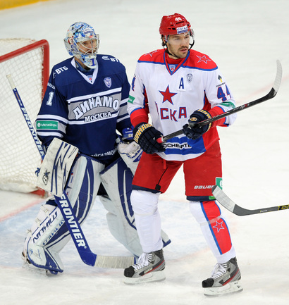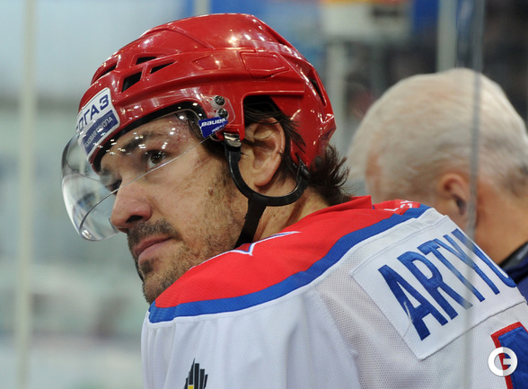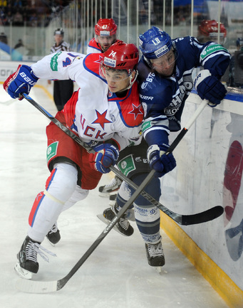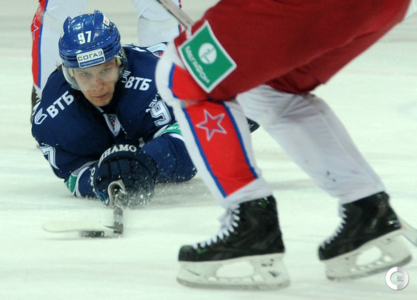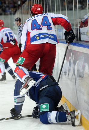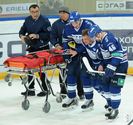 КХЛ. Регулярный чемпионат. "Динамо" (Москва) - ЦСКА - 3:4 Б (1:0, 0:2, 2:1, 0:0, 0:1). Голы: Новак - 2 (Вишневский, Цветков), 13:44 - 1:0. Григоренко - 15 (бол., Радулов, Зайцев), 27:14 - 1:1. Любимов - 4 (Кузьменко), 28:44 - 1:2. Цветков - 5 (Карсумс, Карпов), 40:48 - 2:2. Карпов - 7 (бол.), 53:45 - 3:2. Зайцев - 7 (бол., Прохоркин), 55:59 - 3:3. Победный буллит: Муршак. Нападающий ЦСКА Евгений Артюхин в первом периоде матча регулярного чемпионата КХЛ против московского "Динамо" травмировал колено нападающего соперников Алексея Терещенко. Фото - Никита УСПЕНСКИЙ, "СЭ"