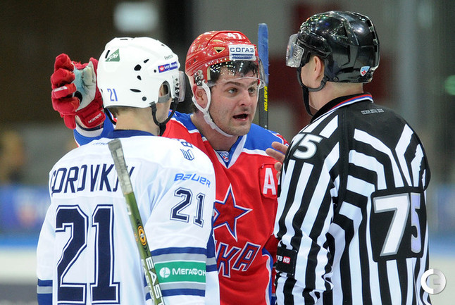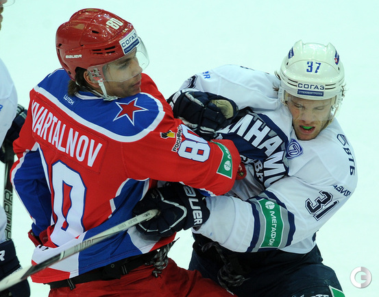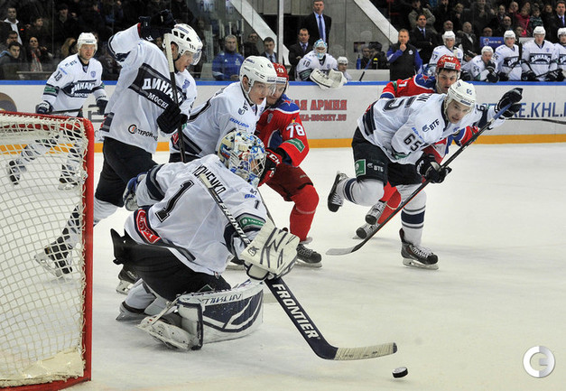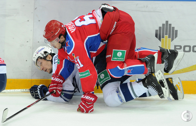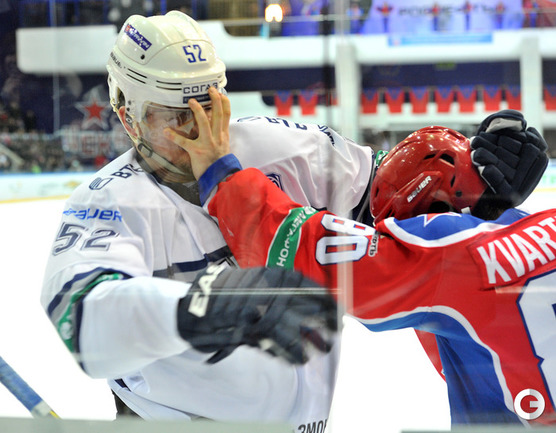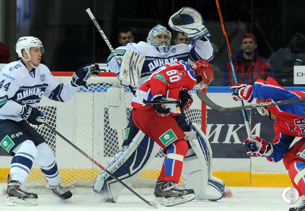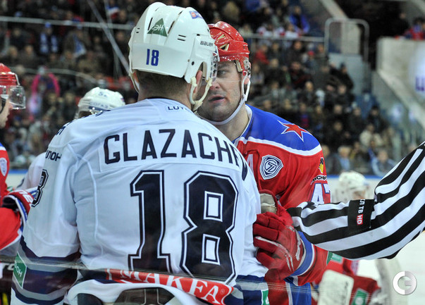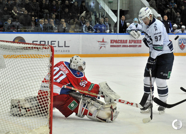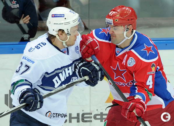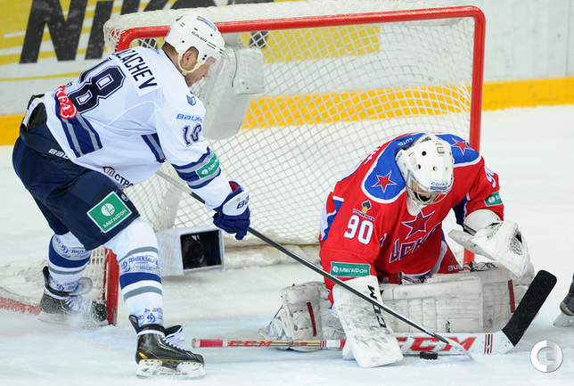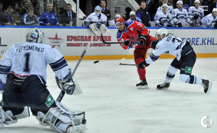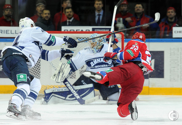 КХЛ. Регулярный чемпионат. ЦСКА – "Динамо" (Москва) – 0:2 (0:0, 0:1, 0:1). ЦСКА на своем льду в матче регулярного чемпионата КХЛ проиграл московскому "Динамо" (0:2). Бело-голубые прервали 7-матчевую победную серию армейцев. Шайбы у "Динамо" забросили нападающие Мартиньш Карсумс и Каспарс Даугавиньш. Отметим, что на двоих команды набрали 62 минуты штрафного времени. Фото - Алексей Иванов, "СЭ", Никита Успенский, "СЭ"