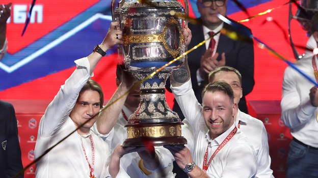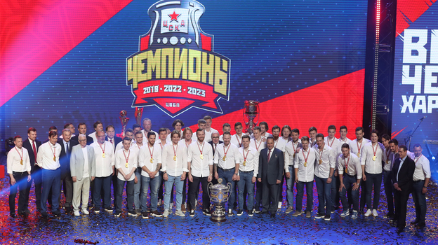 На «ЦСКА Арене» прошла торжественная церемония чествования ХК ЦСКА — обладателя Кубка Гагарина, а также вручение армейцам золотых медалей и Кубка чемпионов России.