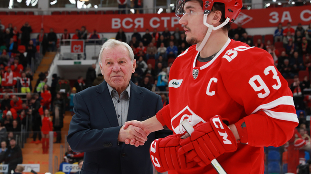 Перед игрой с 85-летием поздравили легенду отечественного хоккея Бориса Майорова.