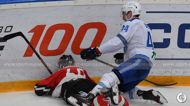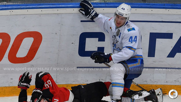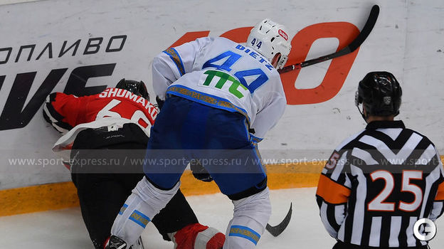 Затем был госпитализирован нападающий "ястребов" Сергей Шумаков. На форварде нарушил правила защитник астанчан Даррен Дитц. Канадец получил 5+20 за атаку соперника сзади.