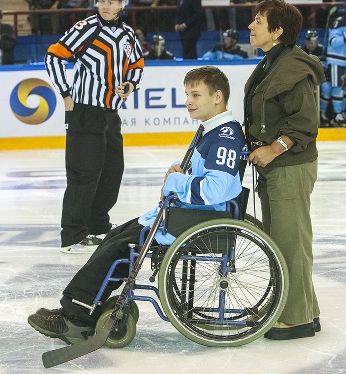 На матч с ЦСКА прошел Василий Даниленко. Это молодой человек, у которого ДЦП, находится под шефством новосибирского клуба. Они подписывали с ним однодневный контракт, помогали со средствами на реабилитацию. И прогресс Василия очевиден. Настолько, что совсем недавно он даже вставал на коньки.