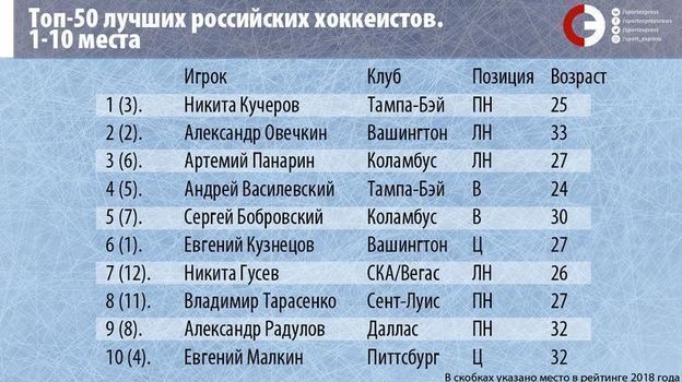 1) По сравнению с рейтингом 2018 года в топ-10 всего два изменения: оттуда выпали Евгений Дадонов и Иван Проворов. Форвард "Флориды" провел сезон ничуть не хуже прошлого, но его обогнали Никита Гусев (за счет чемпионата мира) и Владимир Тарасенко (за счет второй части регулярки и Кубка Стэнли). Проворов же после 17 голов и "плюс 17" сбавил в результативности (7 шайб) и надежности ("минус 16") – он сделал небольшой шаг назад. При этом от Ивана стоит ждать возвращения позиций в первой десятке, Дадонов же, который уже вышел на свой максимум, скорее всего, будет оставаться в начале второй.