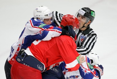 Кстати, последние готовились бить первых не только в фигуральном смысле - вчера хозяева "раздели" на игру всех своих бойцов. СКА, в свою очередь, не поставил в состав Королюка, бывшего лидера команды из Чехова. Боевой настрой "Витязь" начал показывать уже на второй минуте, когда уезжавший на скамейку штрафников Веро толчком в спину свалил форварда гостей Рыбина. Вопрос о том, во что выльется подмосковное "силовое начало", и стал второй интригой матча.