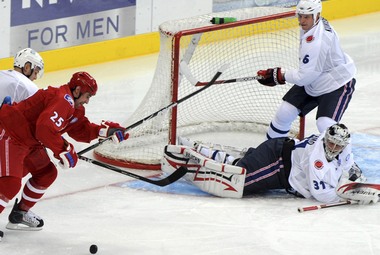 Уже один из первых бросков по воротам Рамо привел к голу. Зарипов выкатился справа, получив передачу от Бабчука, и в стиле Морозова отправил шайбу между щитков финна. Потом "целых" пять минут, до гола Хоссы, зрители заброшенных шайб не видели - только бесконечный розыгрыш вблизи тех или других ворот. Кстати, именно словак из Риги, забросивший первую шайбу "Команды Ягра" в Матче звезд-2010, год назад на Красной площади стал автором победного гола на последних секундах.