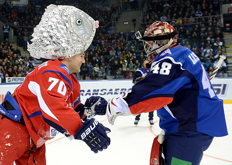 Шестой конкурс – "Эффектный буллит". То есть забить – не самоцель, главное – удивить народ финтом или костюмом, как это сделал форвард "Нетфехимика" Миловзоров в Братиславе, сразив шлемом в форме огромной рыбы.