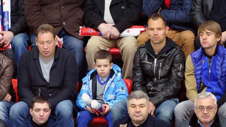 По залу объявили о визите на хоккей главного тренера футбольного ЦСКА Леонида Слуцкого, пришедшего вместе с сыном.