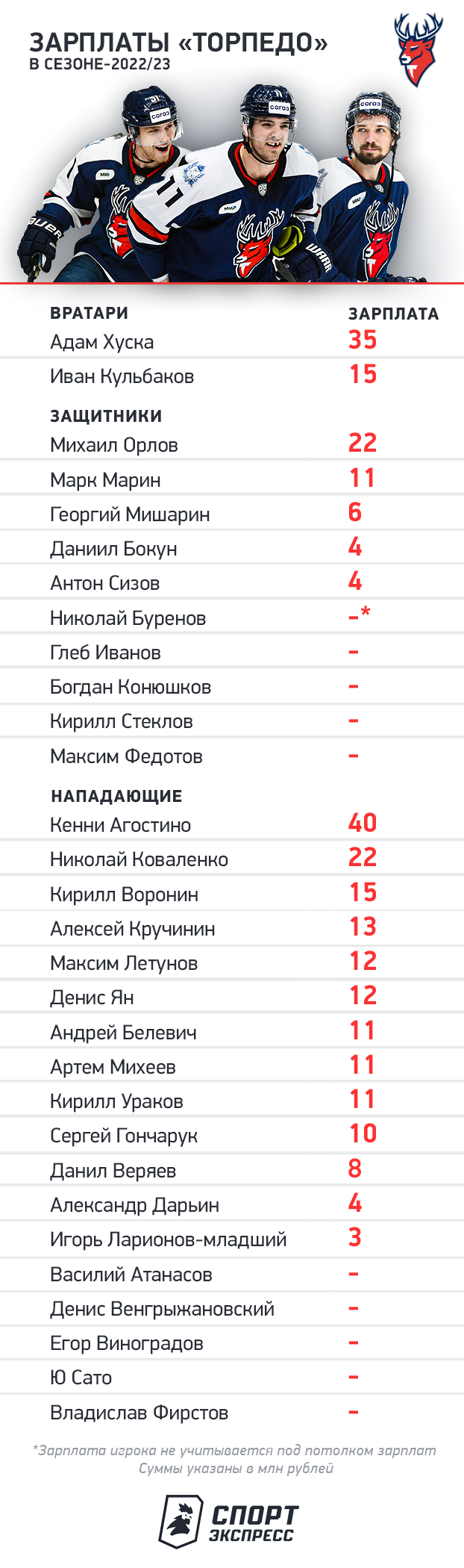 Самый дорогой игрок «Торпедо» — американский нападающий Кенни Агостино. Зарплата в 40 миллионов рублей не должна удивлять. Пусть в этом сезоне Агостино не впечатлял, а потом надолго выбыл из строя из-за травмы, но в прошлом Кенни был одним из лидеров. И при всей непростой ситуации доехал-таки до команды, несмотря на прессинг в родной стране. Хоккеист с таким уровнем мастерства точно пригодится «Торпедо» в этом сезоне.