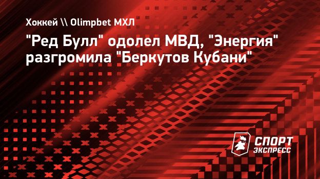 "Ред Булл" в домашнем матче регулярного чемпионата МХЛ одолел МВД со счетом 3:2, "Энергия" на своей площадке разгромила "Беркутов Кубани" (6:1).