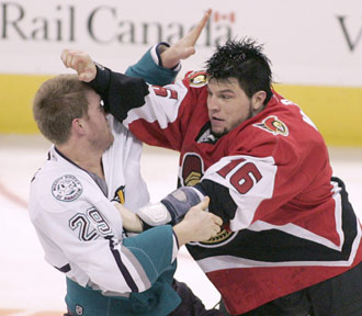 Тафгай "Анахайма" Тодд Федорюк в понедельник был обменян в "Филадельфию", сообщает espn.com. Взамен "Утки" получили право выбора в четвертом раунде драфта новичков-2007. В нынешнем регулярном чемпионате 27-летний нападающий сыграл 10 матчей, набрал 3 очка (3 передачи) и заработал 36 минут штрафа. Федорюк не принимал участия в последних восьми поединках "Анахайма" из-за травмы лицевой кости, которую он сломал 27 октября в драке против "полицейского" "Миннесоты" Дерека Бугара. |