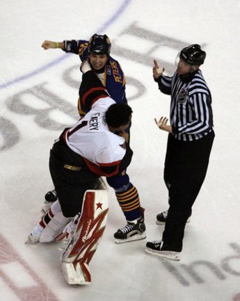 Во втором периоде состоялась драка с участием всех игроков, находившихся на льду. В ней сошлись даже вратари Бирон и Эмери. Судьи выписали 100 минут штрафов (63 из них - хоккеистам "Клинков"), а оба голкипера и форвард "Баффало" Питерс получили матч-штрафы. |