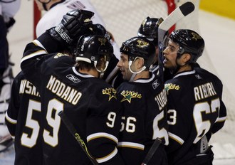 Голы: Сэм Ганье (Нильссон, Писани), 4:26 (0:1). Рибейро (Миеттинен, Нисканен), 6:44 (1:1). Нисканен (ЗУБОВ, Хэлперн), 7:06 (2:1). Пеннер, 8:26 (2:2). Модано (Ю. Йокинен, ЗУБОВ), 9:06 (3:2). Гилберт (Торрес, Столл), 30:40 (3:3). ЗУБОВ (Миеттинен, Рибейро), 34:20 (4:3). Хоркофф (Пеннер, Хемски), 50:36 (4:4). Морроу (ЗУБОВ, Нисканен), 64:00 (5:4 - бол.). |