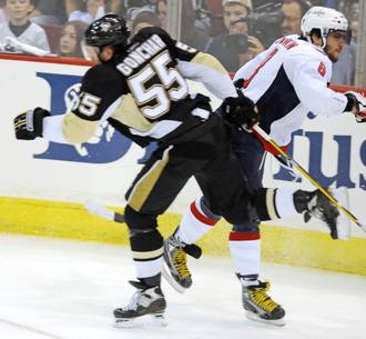 Нападающий "Вашингтона" Александр Овечкин может быть дисквалифицирован на пятый матч серии с "Питтсбургом" за умышленную грубость в адрес защитника соперников Сергея Гончара, сообщает AP. Два россиянина столкнулись в первом периоде четвертого поединка, который прошел минувшей ночью по московскому времени на льду "Пингвинз". Гончар, чья команда в тот момент играла в меньшинстве, выкатывался из-за своих ворот, а Овечкин выставил колено. Как утверждали после матча многие хоккеисты хозяев, нападающий сделал это умышленно. Гончар около минуты не мог подняться со льда, после чего игра была наконец остановлена. Овечкин был наказан двухминутным штрафом. |