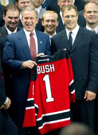 Победитель Кубка Стэнли-2003 - команда "Нью-Джерси Дэвилз" - в понедельник была принята в Белом доме президентом США Джорджем Бушем. Капитан команды Скотт Стивенс вручил главе государства хоккейный свитер своей команды с первым номером. Хоккеисты также удостоились чести посетить знаменитый Овальный кабинет, причем символическую экскурсию провел сам Буш. Отметим, что подобные встречи президента США с победителями Кубка Стэнли являются традиционными. |