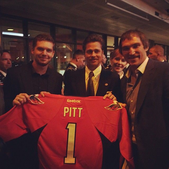 Российские нападающие "Вашингтона" Александр Овечкин и Евгений Кузнецов встретились с известным голливудским актером Брэдом Питтом и вручили ему именной свитер под первым номером. Встреча состоялась на премьере художественного фильма "Ярость" о второй мировой войне, где Питт сыграл роль командира танкового экипажа.