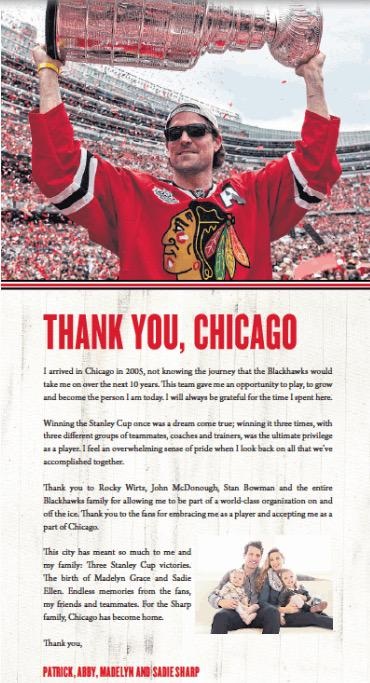 Нападающий Патрик Шарп эффектным образом попрощался с болельщиками "Чикаго". 33-летний форвард выкупил рекламную полосу газеты Chicago Sun и опубликовал свое прощальное письмо. Накануне "Блэкхокс" обменяли игрока в "Даллас" на защитника Стивена Джонса.