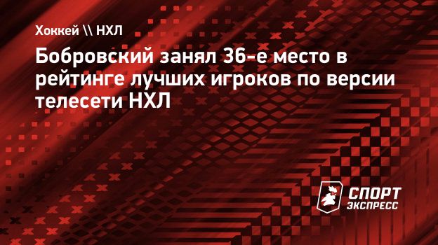 Бобровский занял 36-е место в рейтинге лучших игроков по версии телесети НХЛ