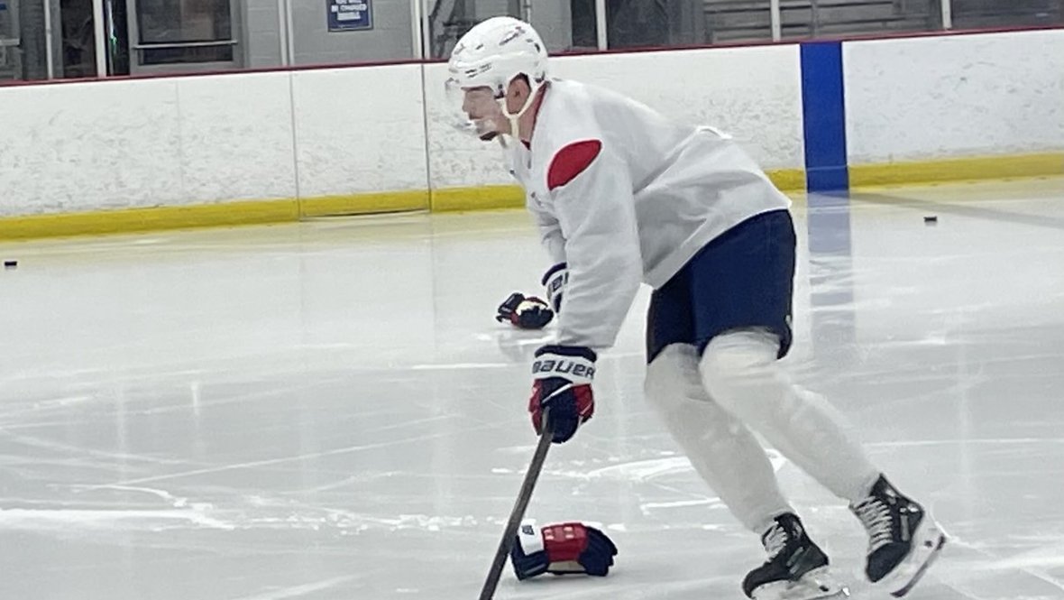 Защитник «Вашингтона» Александр Алексеев тренируется в специальном шлеме после первого матча первого раунда Кубка Стэнли против «Монреаля» (3:2 ОТ), сообщает журналист Том Гулитти.