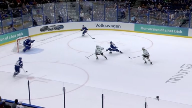 Защитник «Тампы» Михаил Сергачев допустил грубую ошибку у своих ворот в третьем периоде матча НХЛ против «Далласа» (5:4 ОТ), что привело к голу соперника.