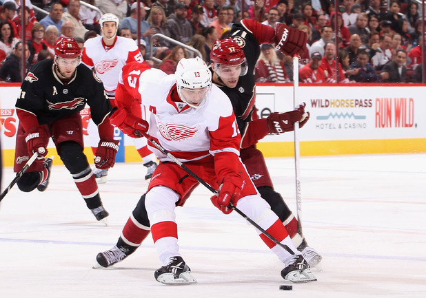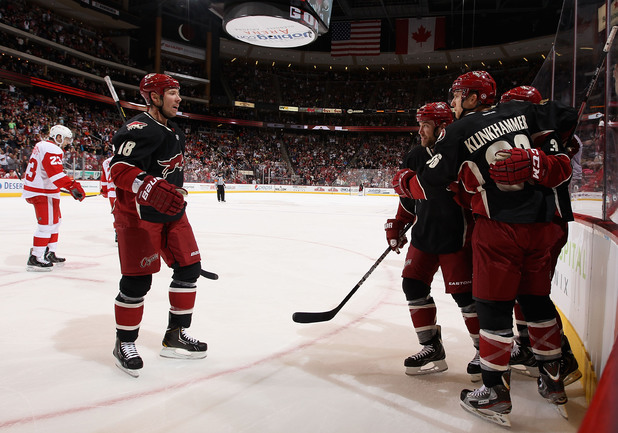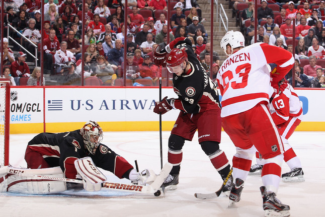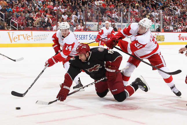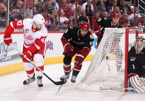 Хоккей. НХЛ. Регулярный чемпионат. "Финикс" – "Детройт" – 2:3 (2:1, 0:1, 0:1). В матче регулярного чемпионата НХЛ "Детройт" на выезде обыграл "Финикс" (3:2). Победную шайбу забросил российский нападающий Павел Дацюк, признанный первой звездой встречи. Фото AFP