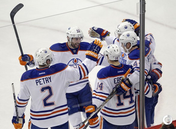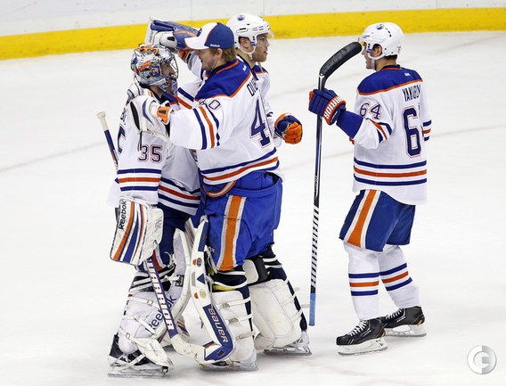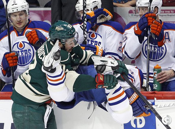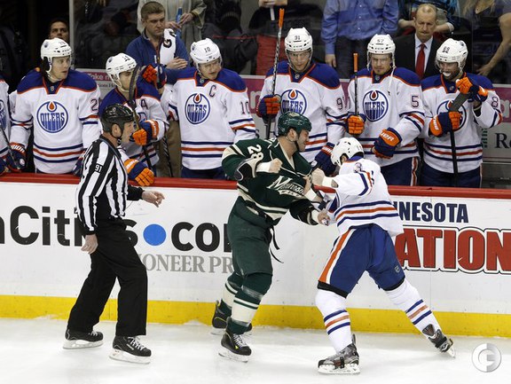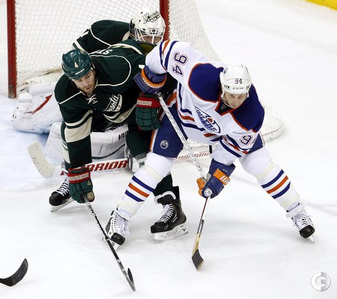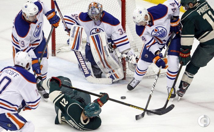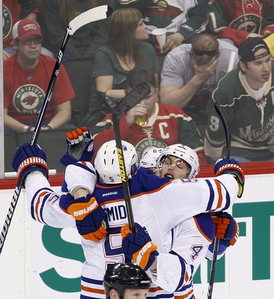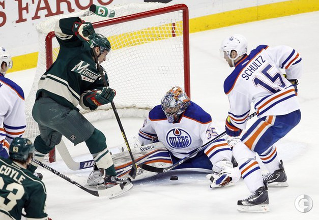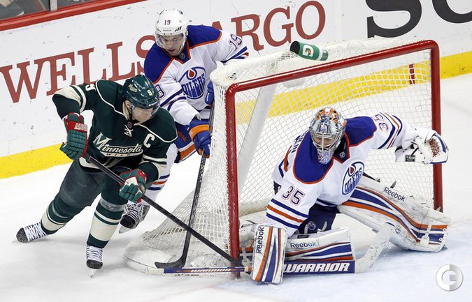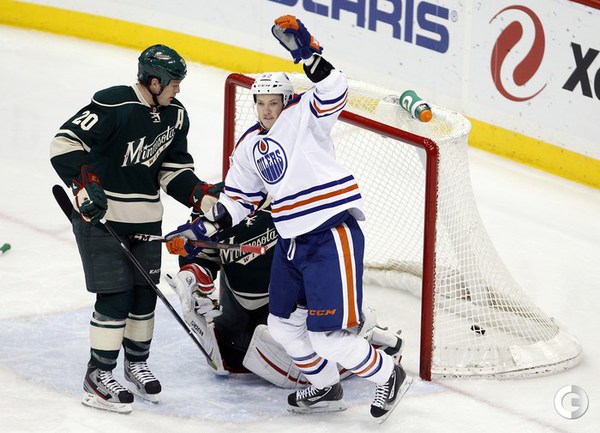 Хоккей. НХЛ. Регулярный чемпионат. "Миннесота" – "Эдмонтон" – 1:6 (0:3, 0:3, 1:0). Голы: Поттер – 2 (Смит, Эберле), 0:27 (0:1). Холл – 16, 8:02 (0:2). Поттер – 3 (Эберле, Ганье), 18:38 (0:3). Эберле – 14 (Смит, Ганье), 24:09 (0:4). ЯКУПОВ – 13 (Холл), 30:13 (0:5). ЯКУПОВ – 14 (Холл, Шмид), 33:55 (0:6). Койву – 11 (Койл), 49:42 (1:6). Дубль Наиля Якупова и прекрасная игра голкипера "Эдмонтона" Николая Хабибулина приблизили "Коламбус" Сергея Бобровского и "Детройт" Павла Дацюка к плей-офф. Фото REUTERS