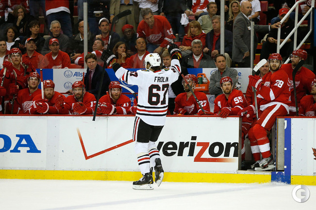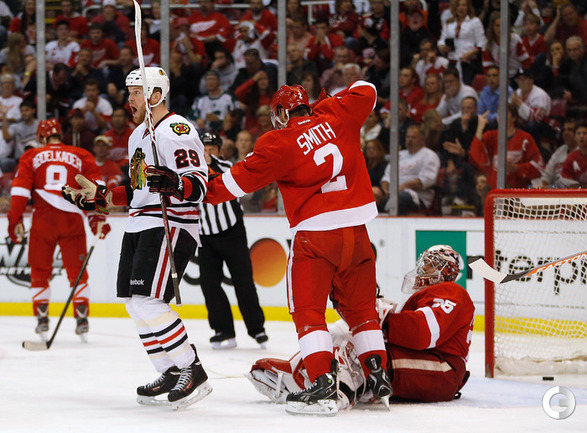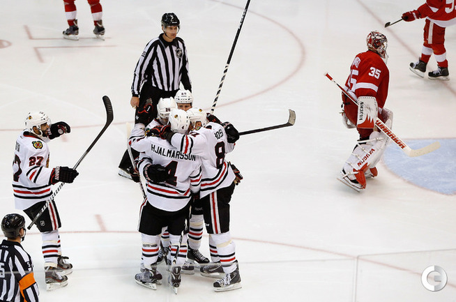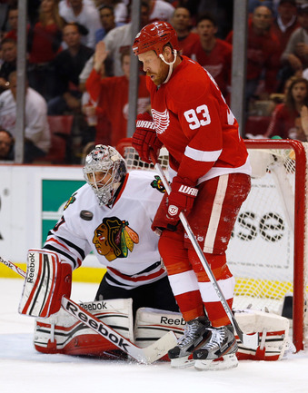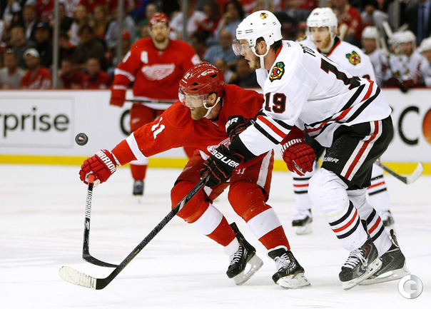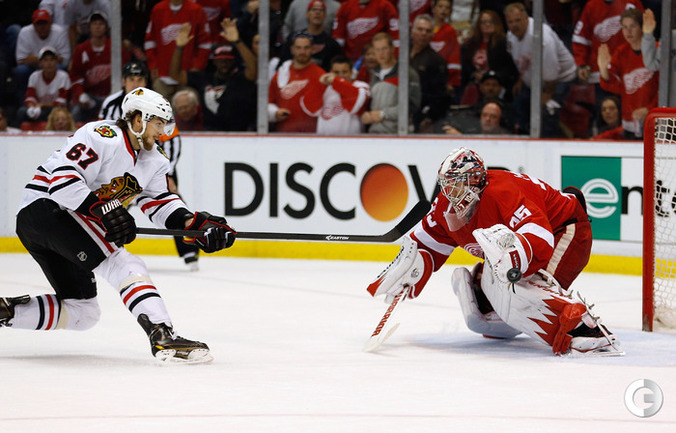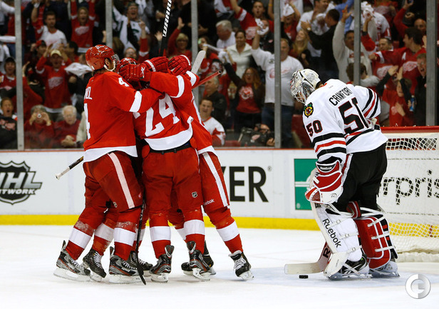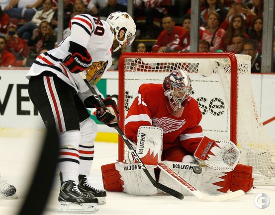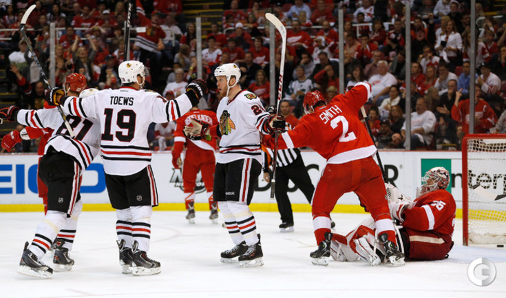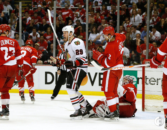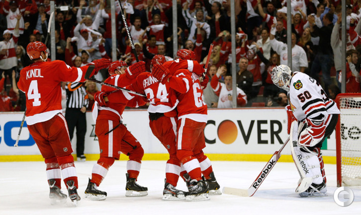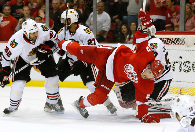 Хоккей. НХЛ. Кубок Стэнли. 1/4 финала. Шестой матч. "Детройт" – "Чикаго" – 3:4 (1:1, 1:0, 1:3). Голы: Хосса – 5 (Тэйвз, Кейт), 03:53 (0:1 – бол.). Ивз – 1 (Д. Миллер, Б. Смит), 18:51 (1:1). Й. Андерссон – 1 (Киндл), 30:11 (2:1). Гандзуш – 1 (Хьяльмарссон), 40:51 (2:2). Биккель – 5 (Тэйвз, Хосса), 45:48 (2:3). Фролик – 3, 49:43 (2:4 – бул.). Брюннер – 5 (ДАЦЮК, Клири), 59:08 (3:4). В шестом матче серии второго раунда Кубка Стэнли "Детройт" на своем льду уступил "Чикаго" . Фото AFP