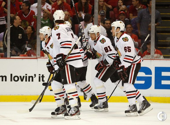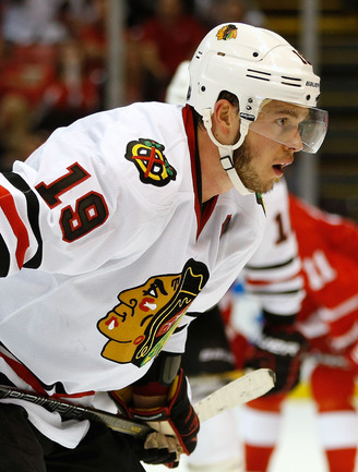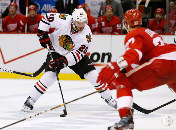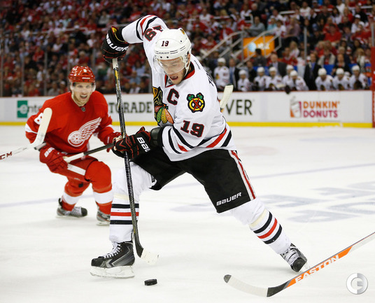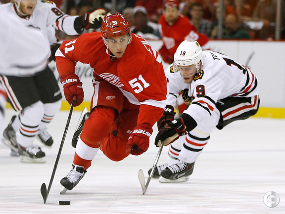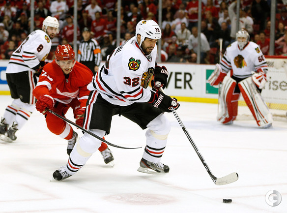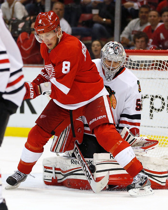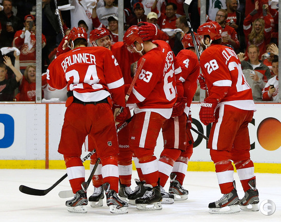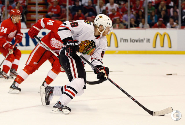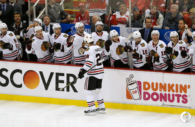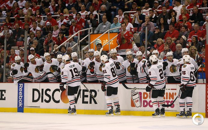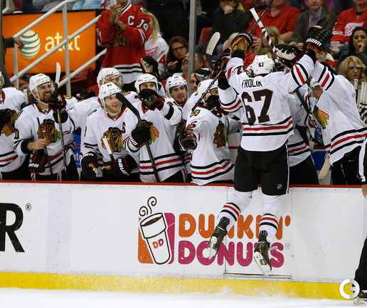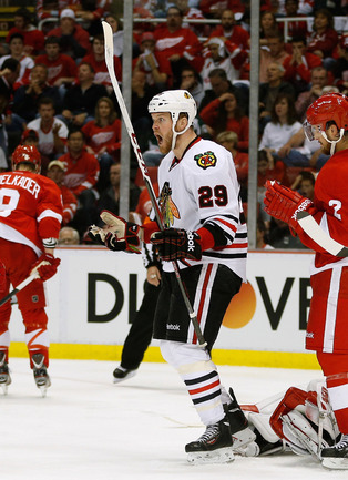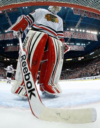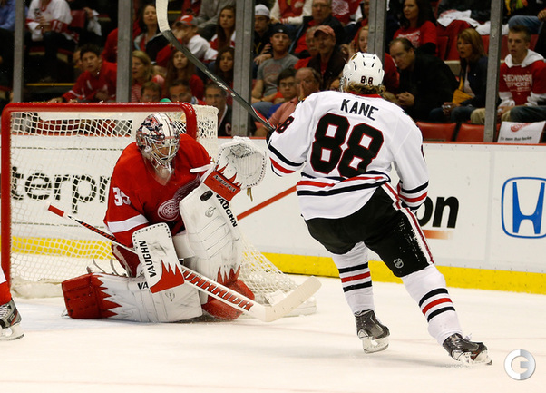 Хоккей. НХЛ. Кубок Стэнли. 1/4 финала. Шестой матч. "Детройт" – "Чикаго" – 3:4 (1:1, 1:0, 1:3). Голы: Хосса – 5 (Тэйвз, Кейт), 03:53 (0:1 – бол.). Ивз – 1 (Д. Миллер, Б. Смит), 18:51 (1:1). Й. Андерссон – 1 (Киндл), 30:11 (2:1). Гандзуш – 1 (Хьяльмарссон), 40:51 (2:2). Биккель – 5 (Тэйвз, Хосса), 45:48 (2:3). Фролик – 3, 49:43 (2:4 – бул.). Брюннер – 5 (ДАЦЮК, Клири), 59:08 (3:4). В шестом матче серии второго раунда Кубка Стэнли "Детройт" на своем льду уступил "Чикаго" . Фото AFP