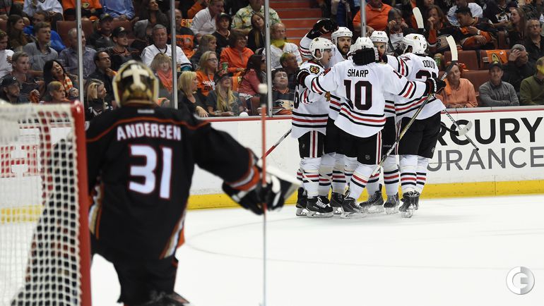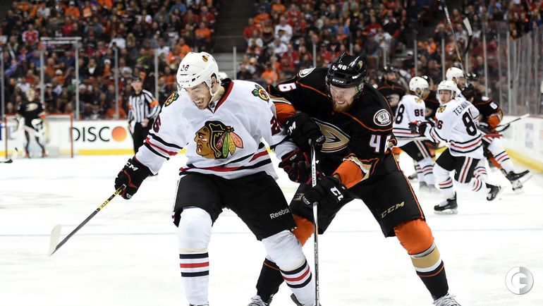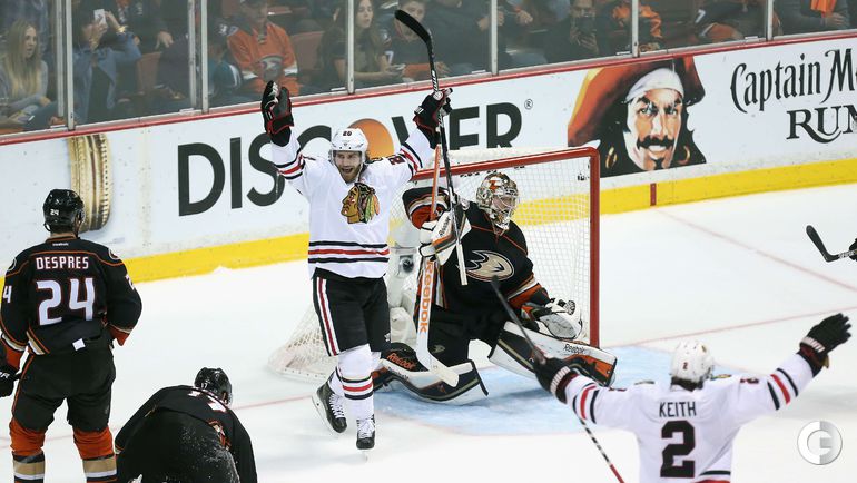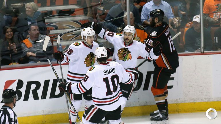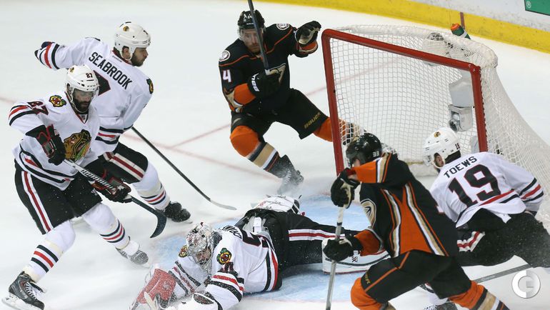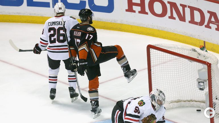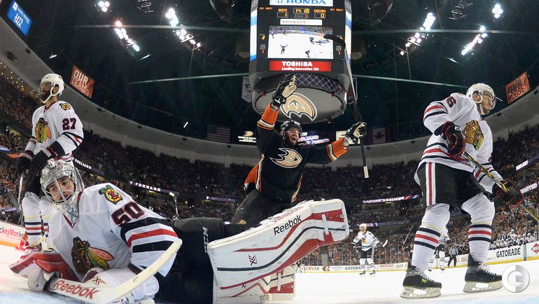 НХЛ. Плей-офф. 1/2 финала. Пятый матч. "Анахайм" – "Чикаго" – 5:4 ОТ (3:0, 0:2, 1:2, 1:0). Голы: Фаулер – 2 (Томпсон, Кольяно), 5:10 – 1:0. Кеслер – 6 (Сильверберг, Бошмен), 5:42 – 2:0. Ватанен – 3 (Гецлаф), 14:37 – 3:0. Терявяйнен – 2 (Верметт, Шарп), 21:11 – 3:1. Сибрук – 5 (Терявяйнен, Шарп), 39:35 – 3:2. Марун – 6 (Ватанен, Гецлаф), 54:45 – 4:2. Тэйвз – 6 (Хосса, Кейт), 58:10 – 4:3. Тэйвз – 7 (Шоу, Сибрук), 59:22 – 4:4. Белески – 7 (Кеслер, Сильверберг), 60:45 – 5:4. Фото AFP