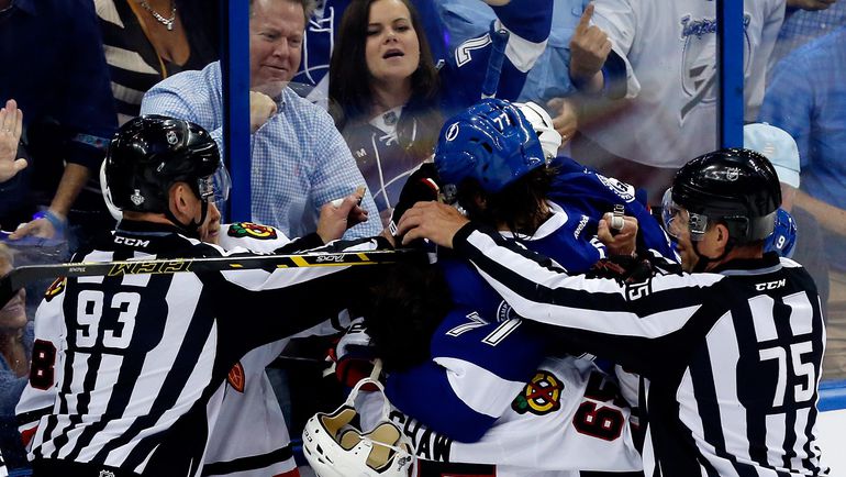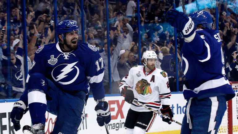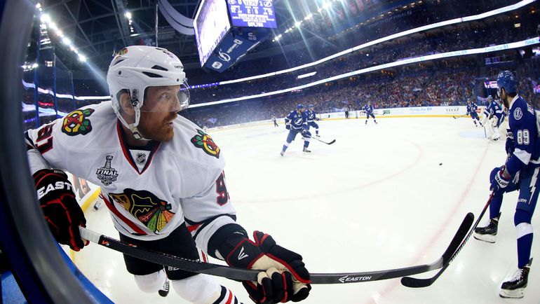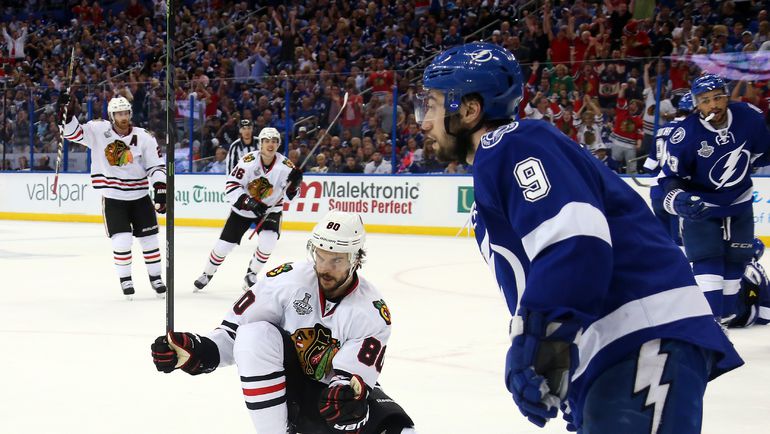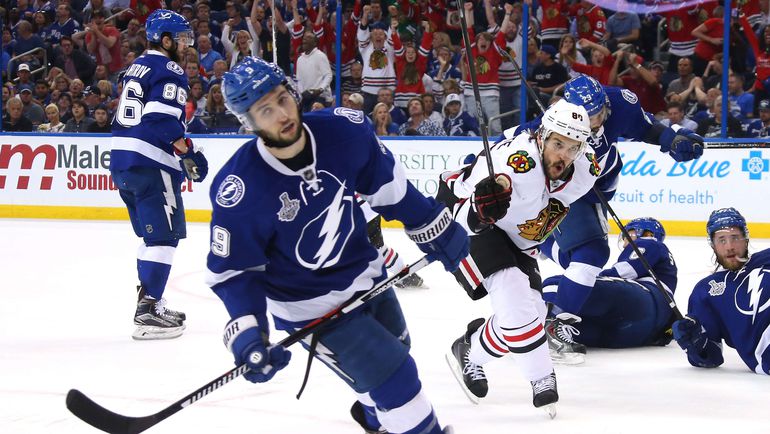 НХЛ. Плей-офф. Финал. Первый матч. "Тампа-Бэй" – "Чикаго" – 1:2 (1:0, 0:0, 0:2). Голы: Киллорн - 8 (Строльман, Филппула), 4:31 - 1:0. Терявяйнен - 3 (Кейт, Шоу), 53:28 - 1:1. Верметт - 3 (Терявяйнен), 55:26 - 1:2. Фото AFP