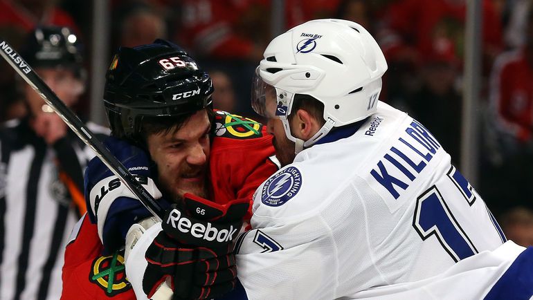 НХЛ. Плей-офф. Финал. Третий матч. "Чикаго" – "Тампа-Бэй" – 2:3 (1:1, 0:0, 1:2). Голы: Кэллахэн - 2 (Хедман, Браун), 5:09 - 0:1. Ричардс - 3 (бол., Хосса, Шоу), 14:22 - 1:1. Саад - 7 (Хосса, Кейт), 44:14 - 2:1. Палат - 8 (КУЧЕРОВ, Джонсон), 44:27 - 2:2. Пакетт - 3 (Хедман, Кэллахэн), 56:49 - 2:3. Фото AFP